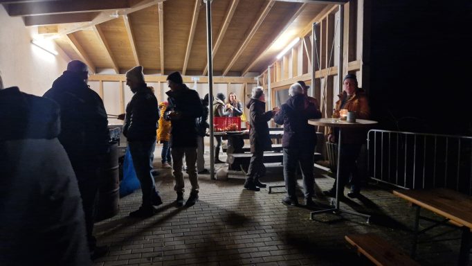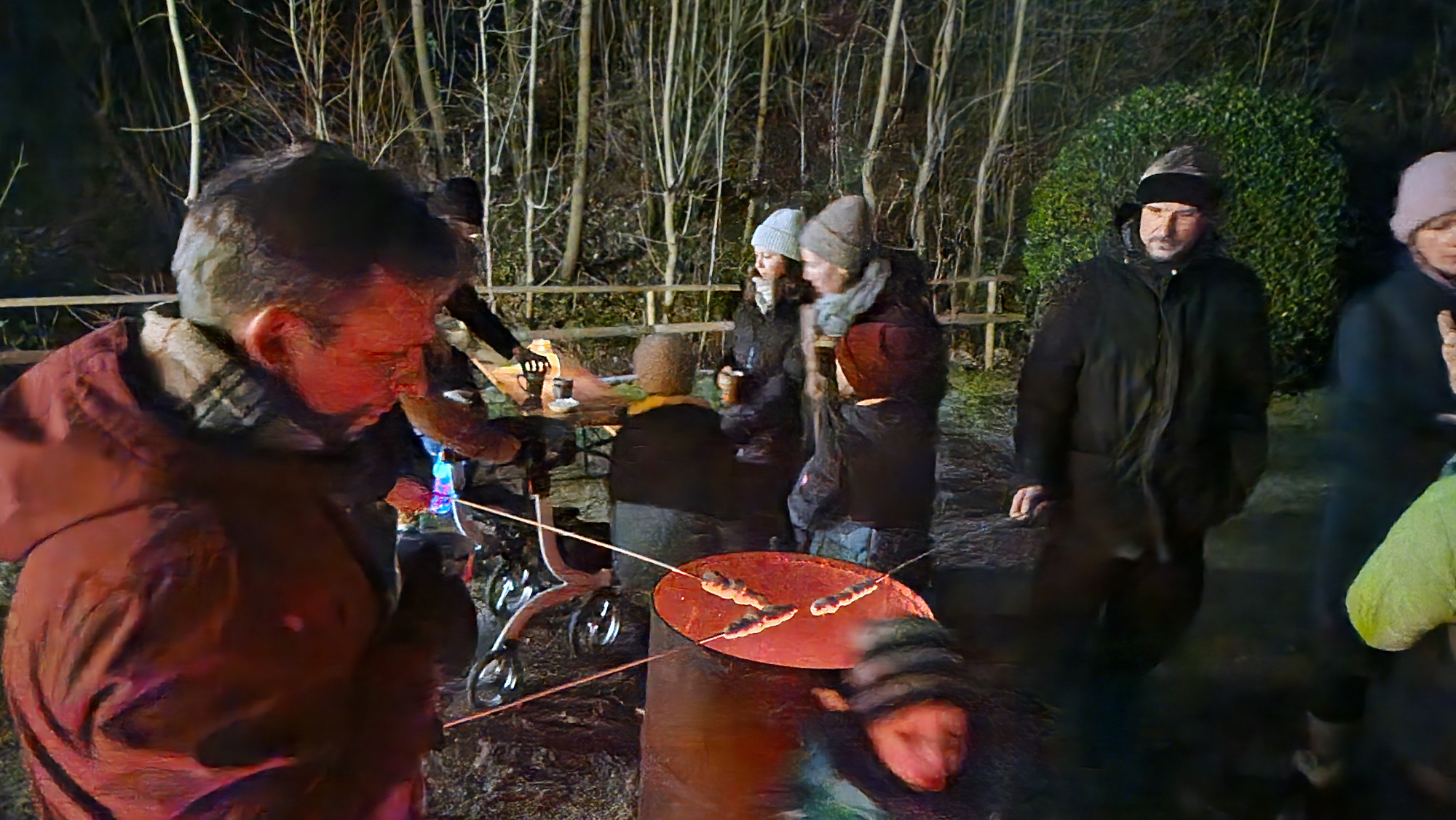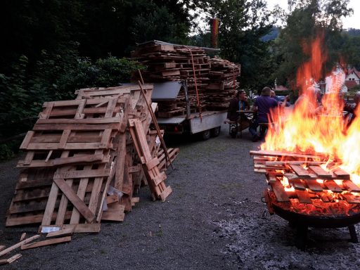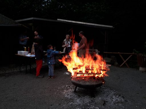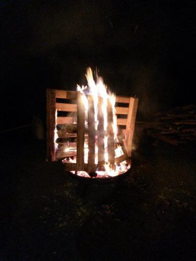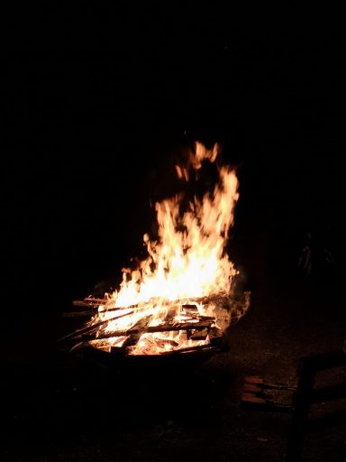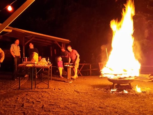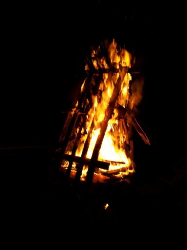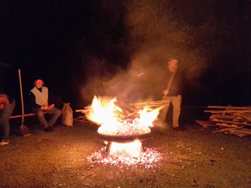 Das Jahr wird abgeschlossen mit einem zünftigen Feuer auf dem Dorfplatz. Die Glut war nach einer Woche noch heiß. Dazu wurde im Zelt gefeiert.