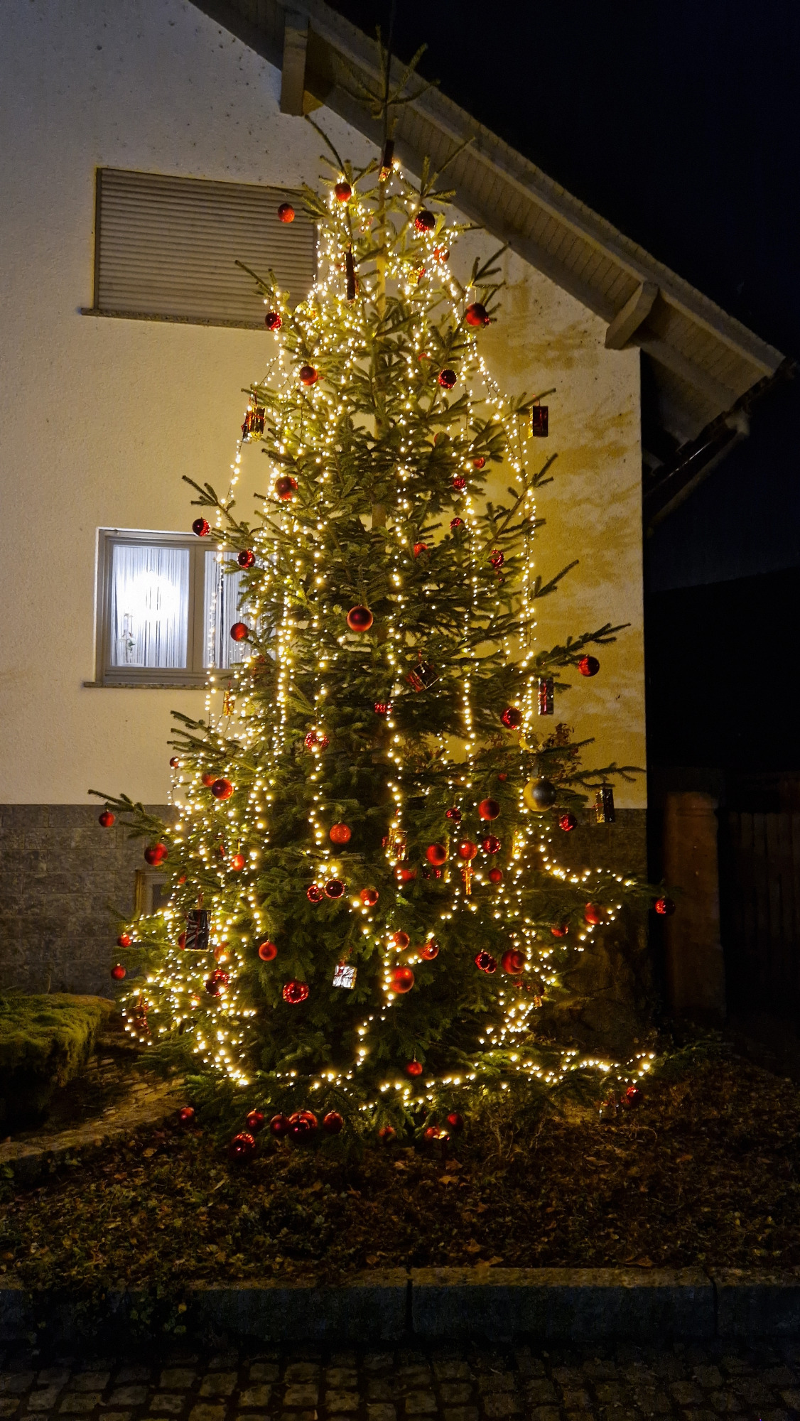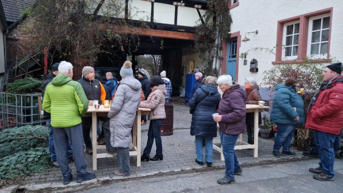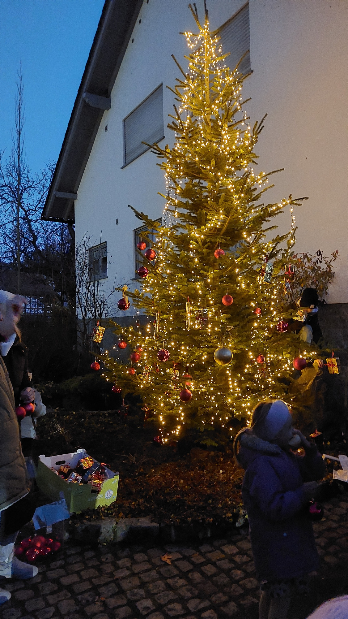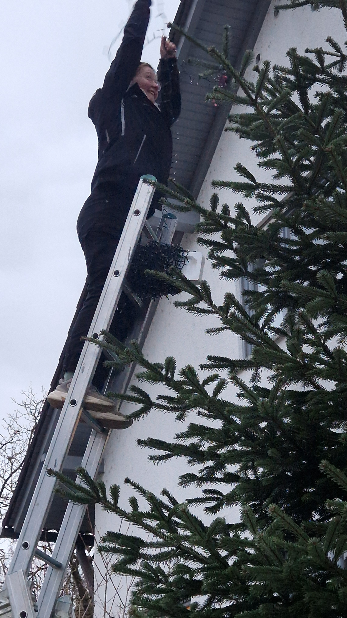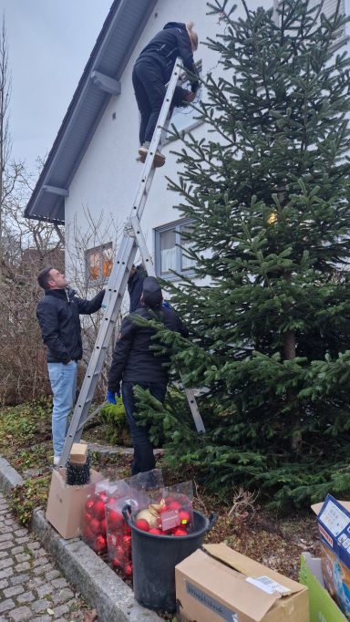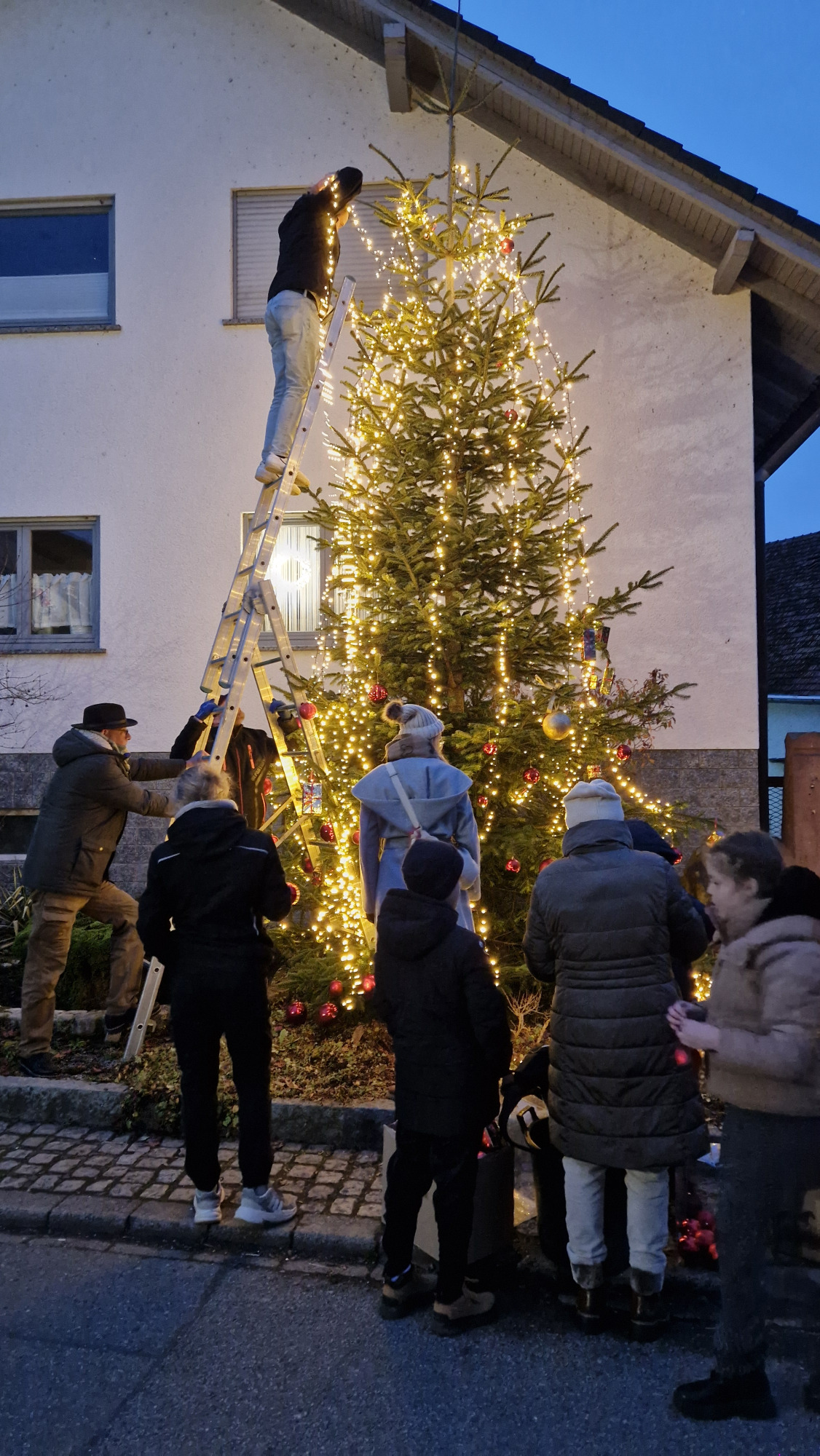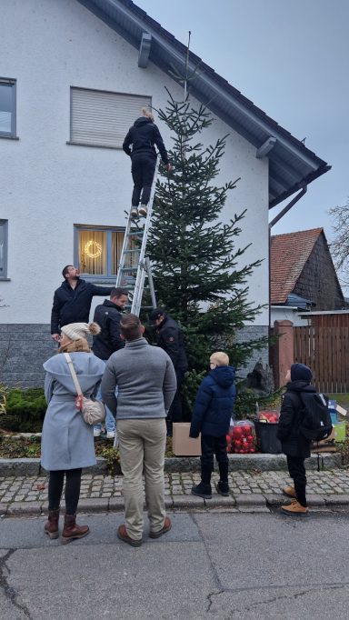 Weihnachtsbaum am steinernen Eck aufstellen und schmücken. Eine prima Gelegenheit für ein kleines Fest mit Glühwein, Punsch, Würstchen und Frikadellen im Hof von Peter Bickelhaupt.