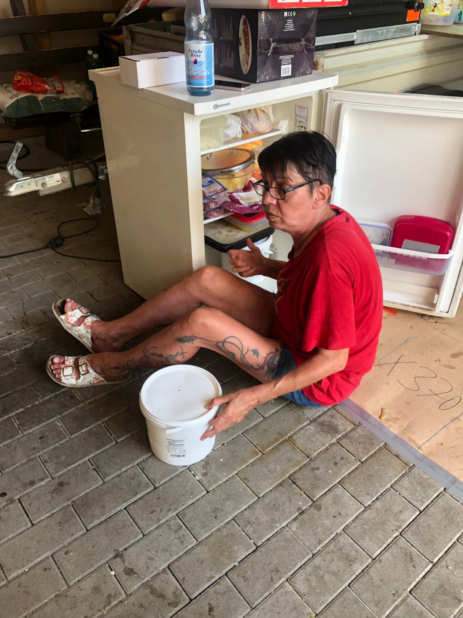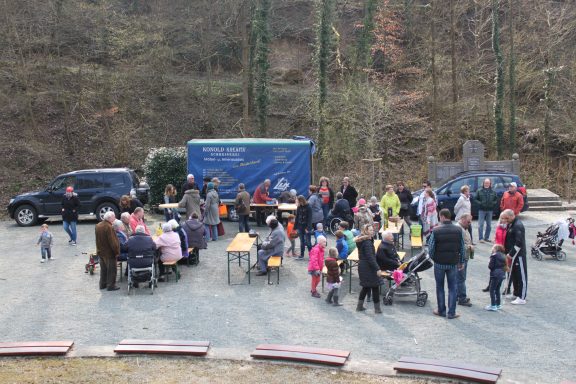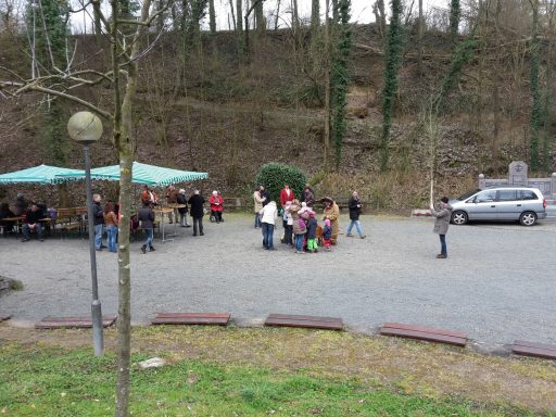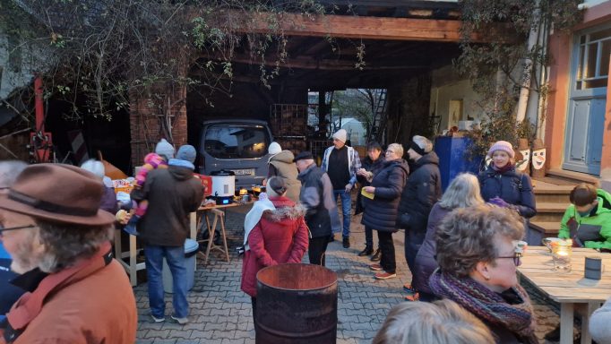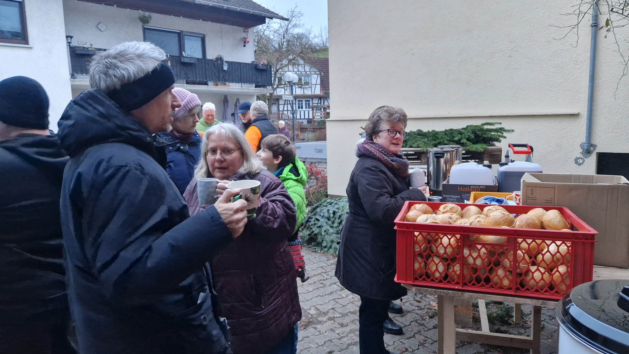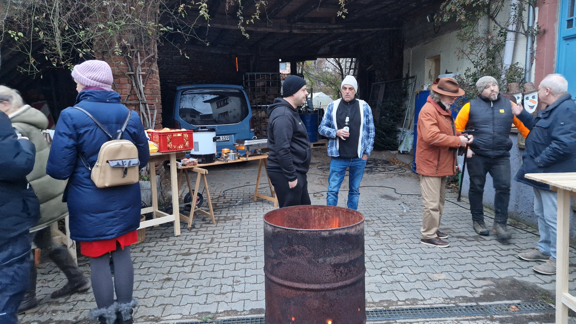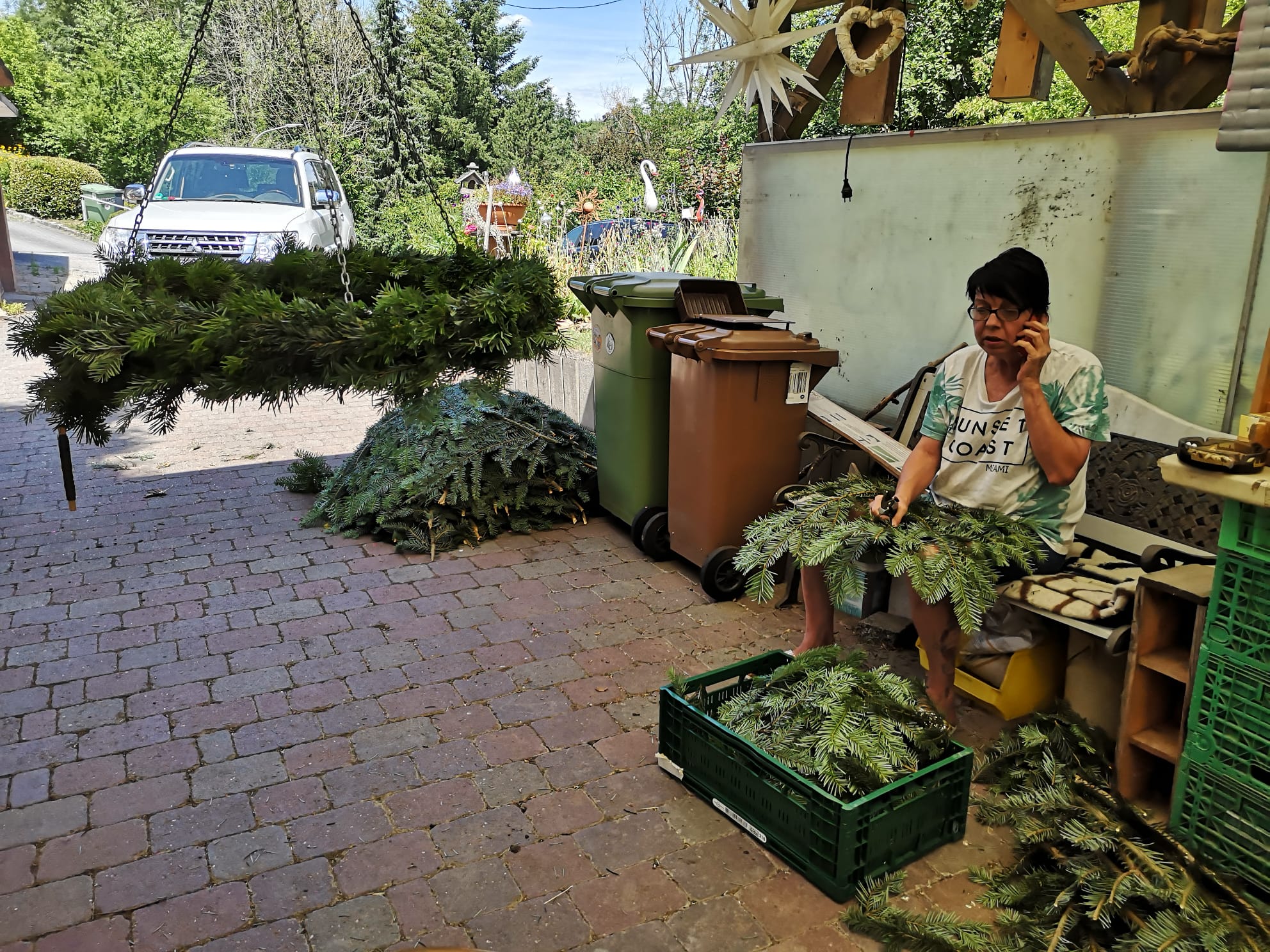Weihnachtsbaum am steinernen Eck aufstellen und schmücken. Eine prima Gelegenheit für ein kleines Fest mit Glühwein, Punsch, Würstchen und Frikadellen im Hof von Peter Bickelhaupt.