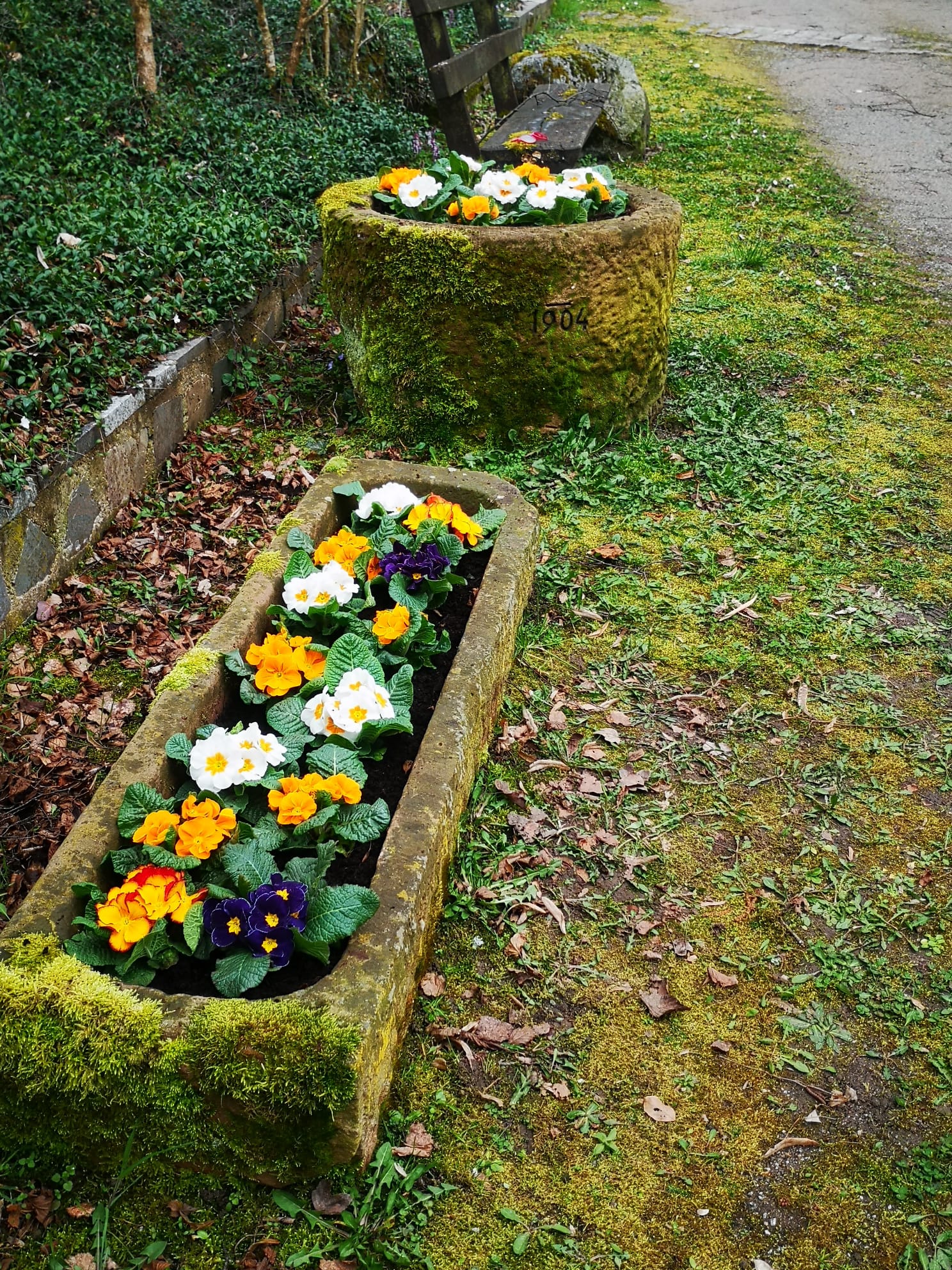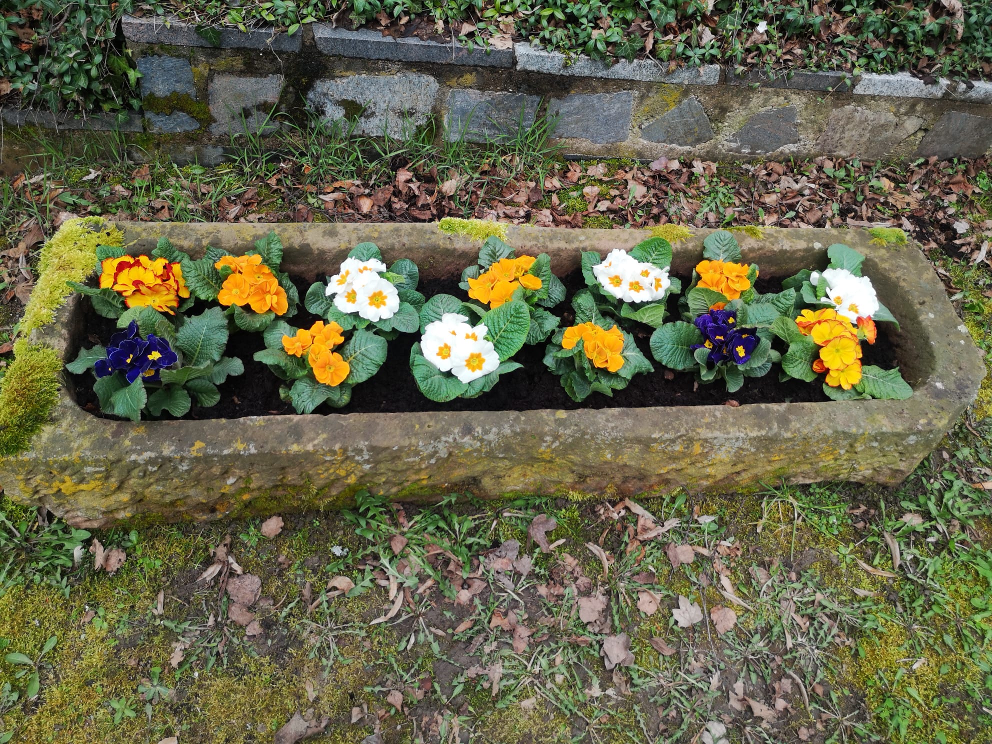 Ein paar Primeln blieben übrig. Anja Germann und Petra Hinlang haben damit den Dorfplatz verschönert.